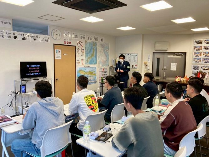 警察の交通安全課の方に研修センターに来て頂き、交通安全講習を受講しました。母国でも日本の交通ルールを学んできましたが、実際に日本に入国してから、目に映る道路や歩行者・自転車・自動車が規則正しく整備されている事に一番驚くようです。しっかり交通ルールを学習し、事故の無いように生活してもらいたいです。母国語通訳もしながら、真剣に講習を受ける事が出来ました。