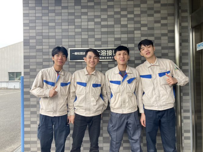 愛知県で実習をしている実習生4名の半自動溶接作業の技能評価試験が実施されました。学科試験では、少し緊張したようですが、手応えがあったようです。実技試験は、熱心な実習担当者の指導のおかげで、大きなミスやケガもなく、受検することができました。さらなるレベルアップができるように激励しました!