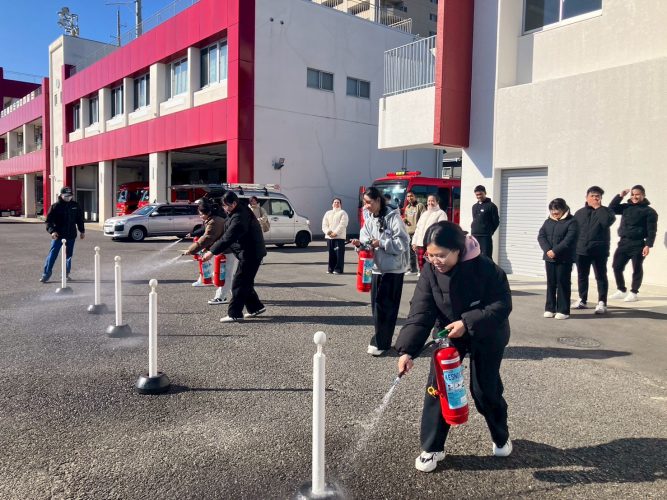 入国講習の一環で、防災講話、消火訓練を実施しました。日本で、火事・災害があった時には、どうしたらいいか?消防士の方に、親切に指導して頂きました。実際の消火器や消火栓の使い方を詳しく教えて頂き、いざという時は、どうしたら良いか全員が認識することが出来ました。