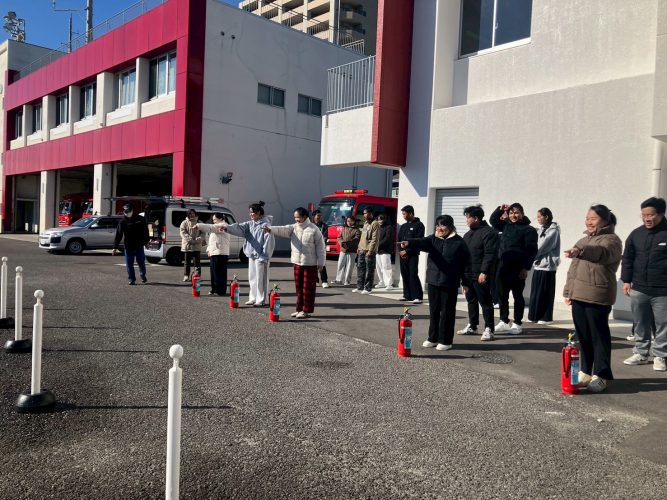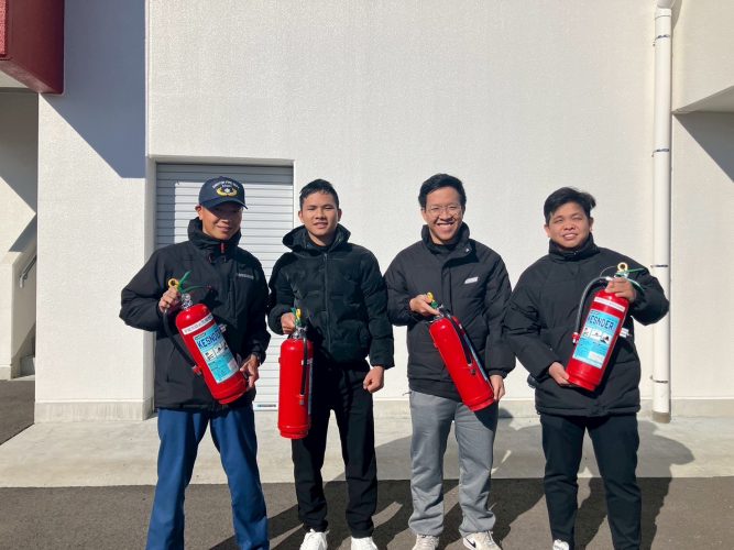 入国講習の一環で、防災講話、消火訓練を実施しました。日本で、火事・災害があった時には、どうしたらいいか?消防士の方に、親切に指導して頂きました。実際の消火器や消火栓の使い方を詳しく教えて頂き、いざという時は、どうしたら良いか全員が認識することが出来ました。